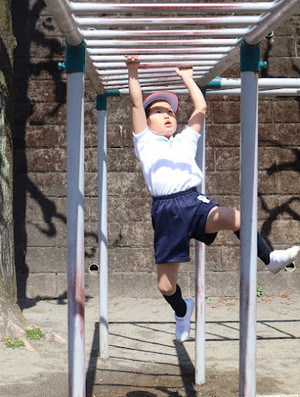 手をつないで外に出る姿がほほえましいです。鉄棒や滑り台、ロープなどの遊具で楽しく遊んでいました。